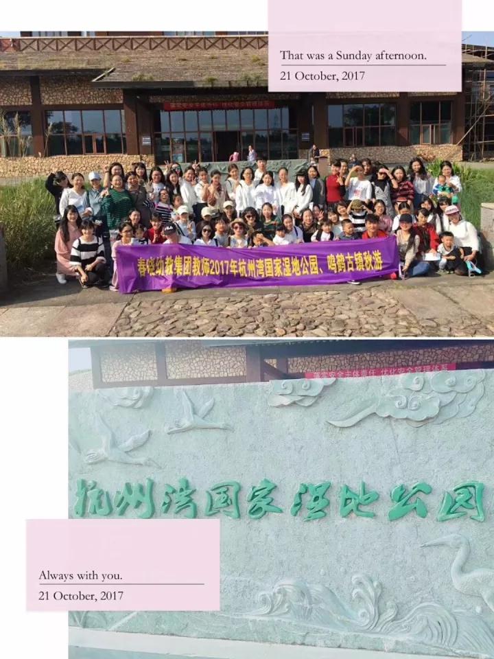 十月二十一日的清晨,秋意浓浓~上周末春晓幼教集团的老师们踏着露珠,呼吸着秋的气息开启了欢乐的度假旅程!此次活动本着“携手职工、传递关爱”的精神,老师们远离城市的喧嚣,暂放幼儿教师的职责,融入这片静谧而优美的环境————杭州湾国家湿地公园。